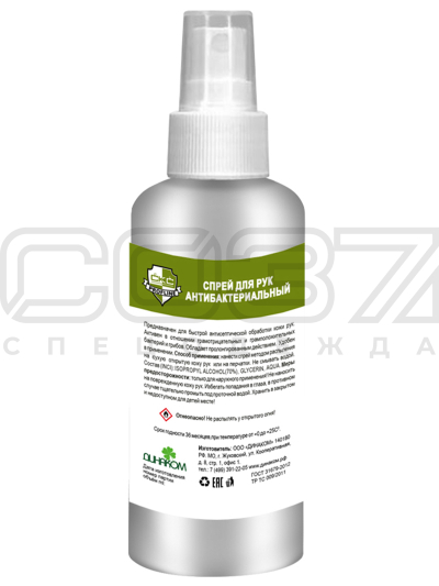Антибактериальный спрей предназначен для быстрой гигиенической обработки участков кожи при работе с неблагоприятной бактериальной средой, для быстрой дезинфекции кожи без использования воды. Обладает пролонгированным действием.